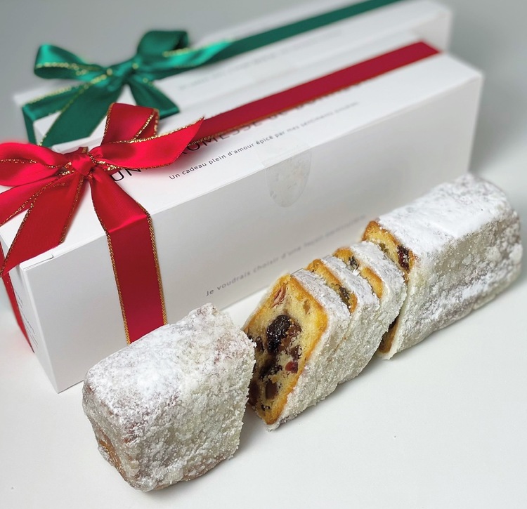初夏から約3ヶ月間じっくりとラム酒に漬け込んだ多種のドライフルーツと香ばしいナッツをたっぷりと練り込んだクリスマス限定のリッチな「シュトーレン」センターにはイチジクやプルーンのコンポートを詰め込みフルーティーに仕立て、たっぷりの澄ましバターを染み込ませて仕上げました。