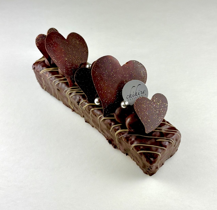 ナッツをたっぷり練り込んだ濃厚なケークショコラに、オレンジの香りとトロッとするなめらかなキャラメルを仕立て、ショコラノワールで丁寧にコーティング。生チョコレートとショコラパーツで可愛らしくデコレーションしたバレンタイン限定のキャラメルを閉じ込めたショコラのパウンドケーキ。