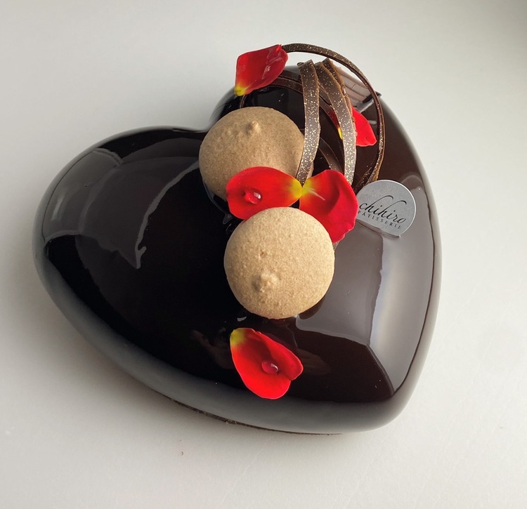 一晩かけて低温でじっくり抽出したコーヒージュレ、トンカ豆のブリュレ、軽くエアリーに仕上げたホワイトチョコのムース、土台にはプラリネのフィアンティーヌでサクサクの食感をアクセントとし、黒トリュフの香るマカロンで華やかに仕上げた予約制の特番なアントルメ。是非ギフトや記念日にご利用下さい。
